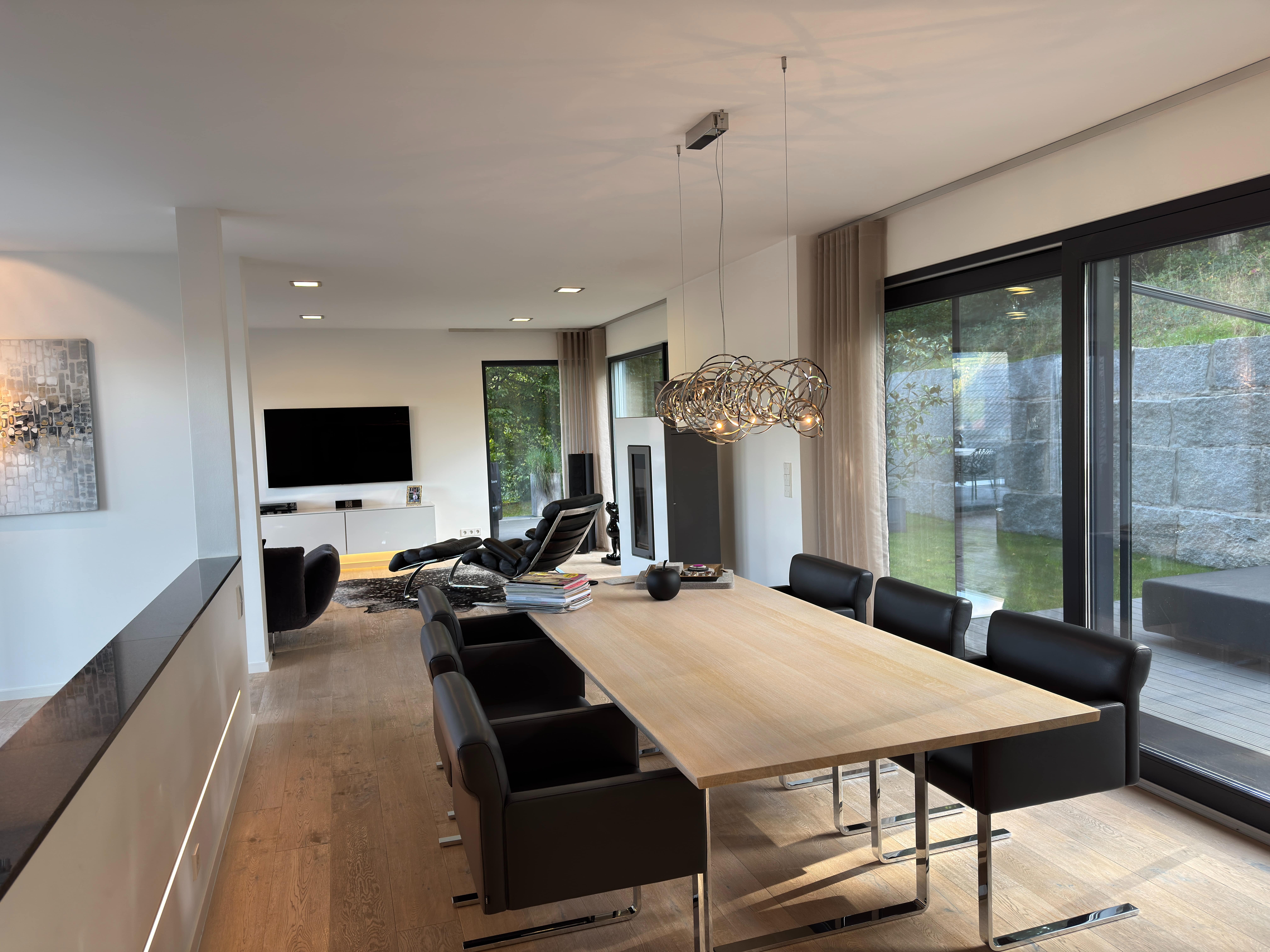 Eine freischwebende, geradlinige Treppe führt hinauf zur Wohnebene, die mit lichtdurchfluteten Räumen, großzügigen Fensterflächen und gläsernen Balkongeländern beeindruckt. Der Wohnbereich verbindet modernen Komfort mit gemütlicher Eleganz: Die hochwertig ausgestattete Küche, der Kamin und der direkte Zugang zum Garten schaffen ein stilvolles und einladendes Ambiente. Auf dieser Ebene befinden sich zudem ein Gäste-WC und ein zusätzliches Zimmer, aktuell als Büro genutzt, das ebenfalls einen traumhaften Blick ins Grüne bietet.