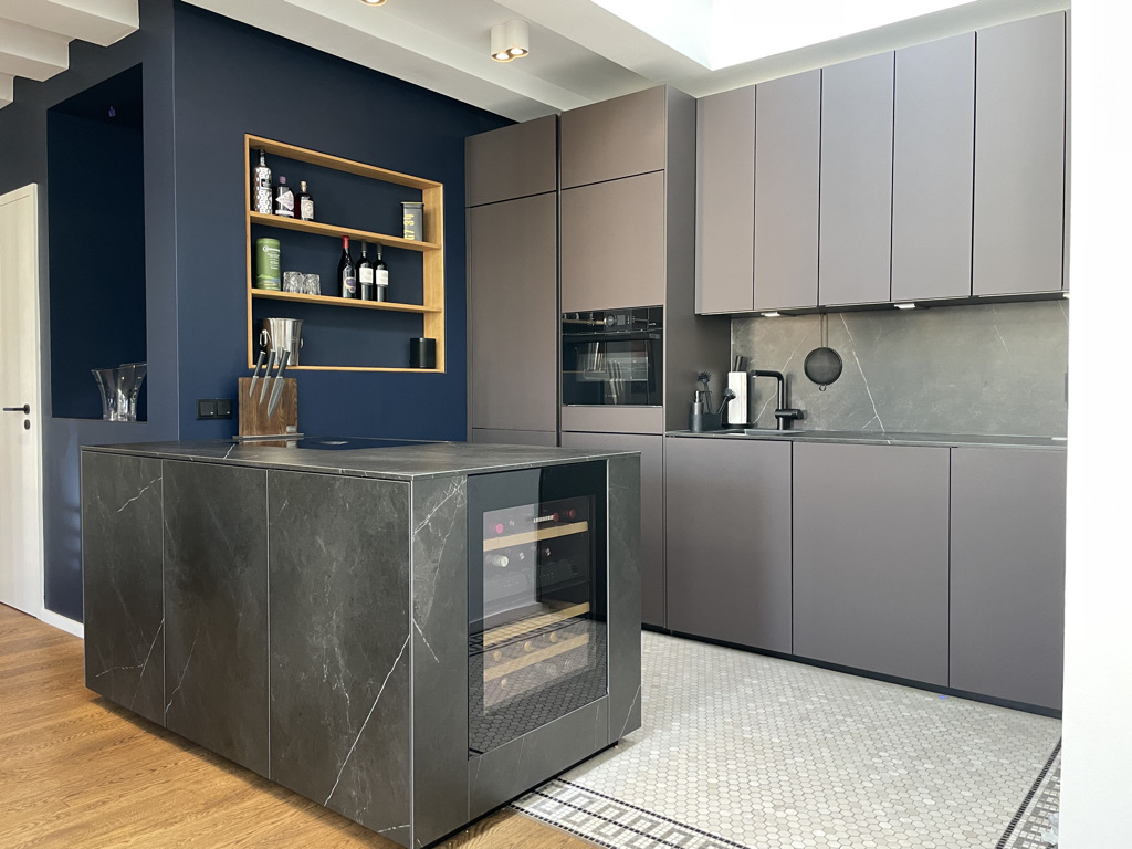 In der gesamten Wohnung – mit Ausnahme des Badezimmers und des Küchenbereichs – ist hochwertiges Parkett verlegt. Das Badezimmer ist mit eleganten Fliesen ausgestattet, während die Küche durch stilvolle Mosaikfliesen Akzente setzt.